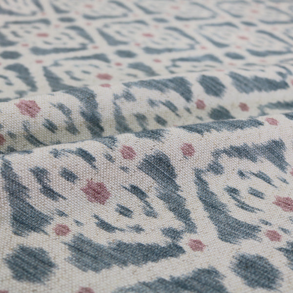 A beautiful Ikat fabric in a beautiful blue and pink geometric design on a fabric suitable for all soft furnishing projects including cushions, curtains and blinds. Featuring a mainly dark blue with pink dots Ikat design on white. This Ikat print is in a high quality cotton and linen mix for enduring quality and timeless elegance.