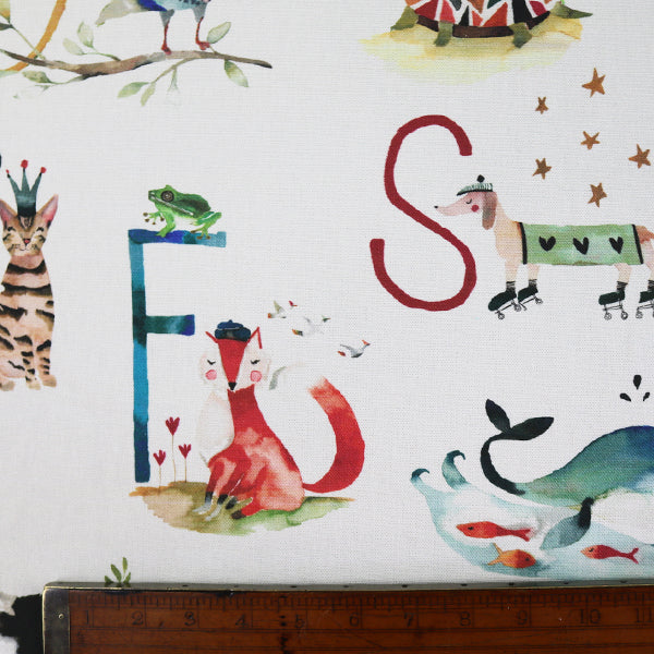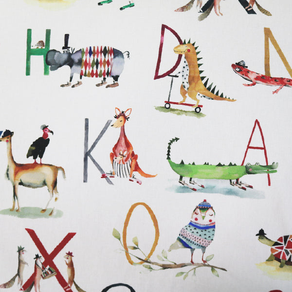 Gorgeous children's furnishing fabric perfect for a nursery featuring cute animals representing different letters of the alphabet. Suitable for curtains, blinds and cushions.