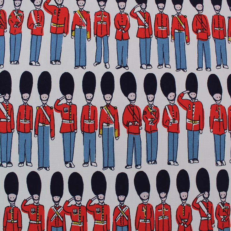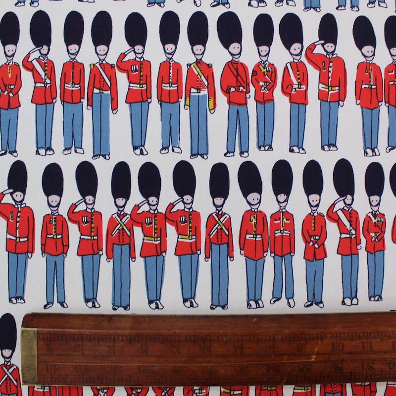 Gorgeous Cath Kidston fabric featuring The King's Guard soldiers in their trademark busby hats in red and blue on a white background. Perfect for all furnishing projects and would make super curtains, blinds or cushions in children's bedrooms.