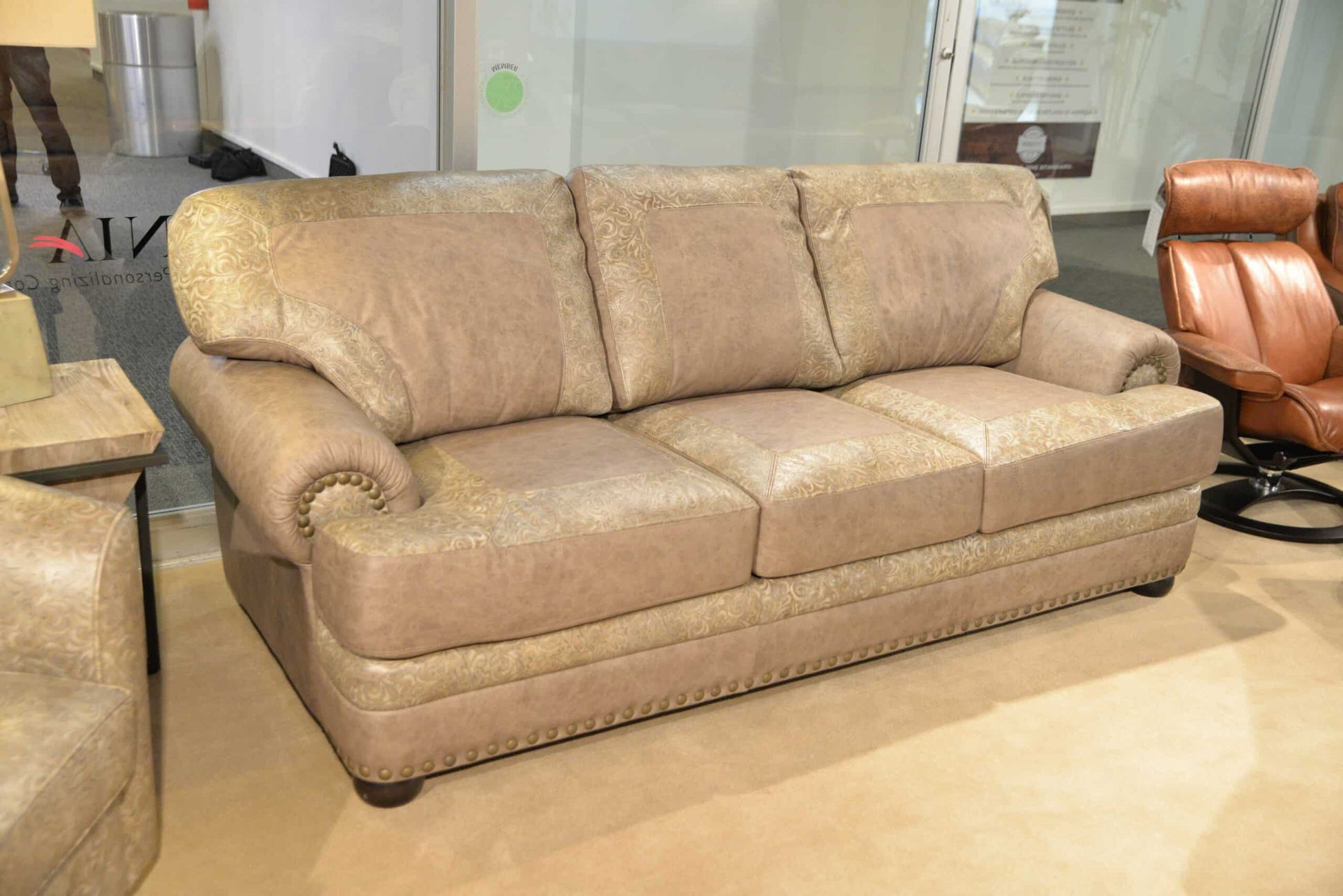 Houston 2 Seat Sofa In Saloon Mushroom Leather (Grade 3) - Celine Truffle Tooled Leather On The Picture Frame Of Cushion Backs, Seat Cushions And Front Rail - Nailhead: Large Brass-Chaise 72W