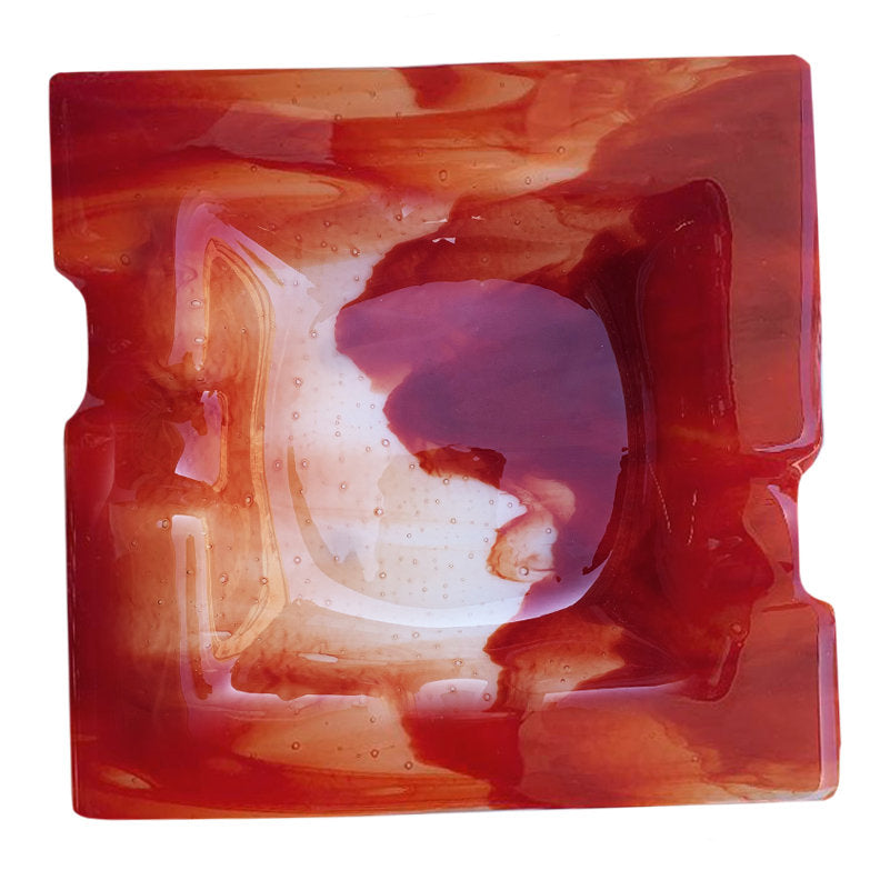 Rich red smoky designs create this spectacular artisan glass ashtray. It measures 8” x 8” and features notches for 2 cigars.