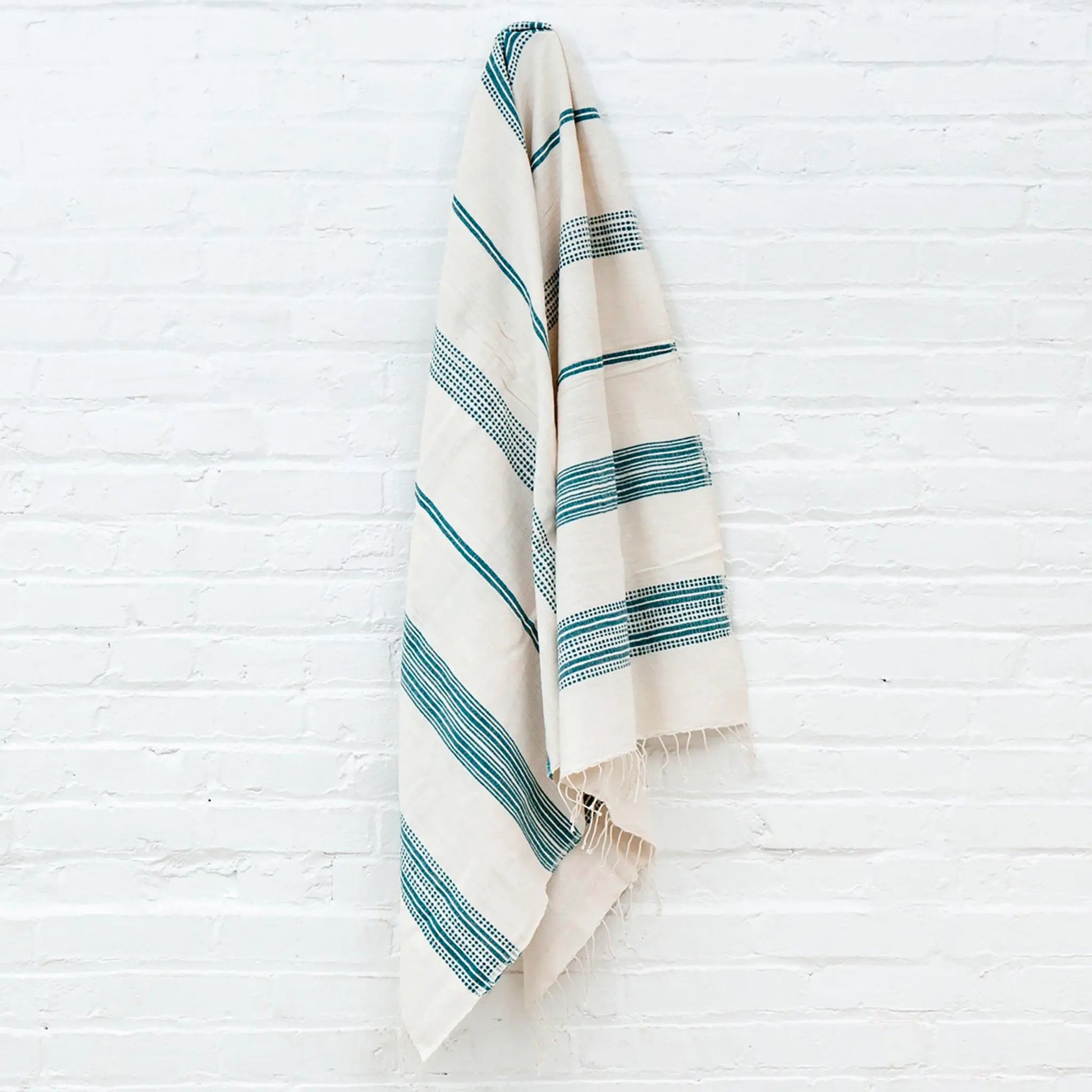 The Tana Teal Bath Towels are handmade in Ethiopia by master artisans with cotton that is hand spun, dyed and woven. The result is a teal bath towel embellished with timeless geometric details. These stylish coastal bath towels have pristine stripes, reflecting contemporary Ethiopian design. The Tana teal bath towels are a must-have bathroom accessory for every day use or to keep on hand when guest's stay.