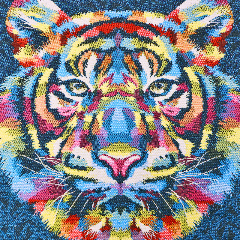 A gorgeous tapestry panel fabric featuring a multicoloured tiger face on a petrol blue background. In high quality polyester and cotton it is perfect for a cushion cover or bag.