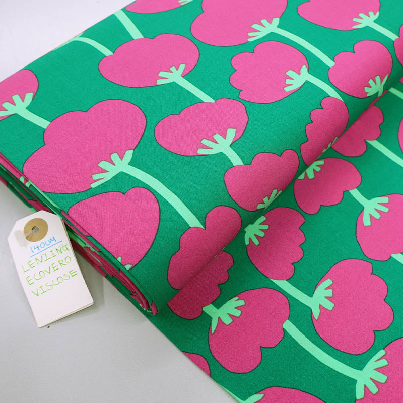 Gorgeous viscose fabric from designer Nerida Hansen featuring a modern floral print of pink blooms on a bright green background. Made from 100% LENZING™ ECOVERO™ which is a greener type of viscose, it is perfect for dressmaking and would make a stunning dress or top.